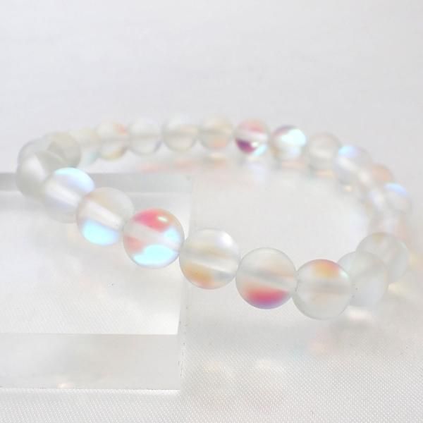 ガラスビーズの一種で、ガラスの中央に光沢のあるオーロラフィルムを挟むことで、光を受けると虹色に輝くよう加工されています。ルナフラッシュの輝きは、月のエネルギーを反映しているとされ、感性や直感を刺激し、心のバランスを整える効果があるとされています。また、ルナフラッシュはクリエイティブなエネルギーや癒しのエネルギーをもたらすとも言われています。