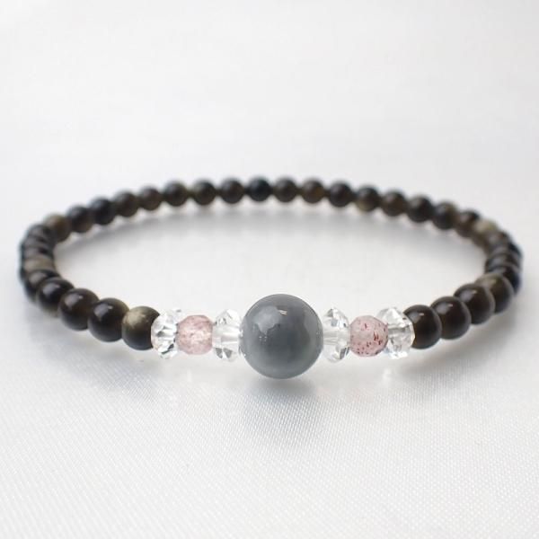 グレー翡翠 & ストロベリークォーツ & ゴールデンオブシディアン デザインブレスレット 内周15cm [X5915]