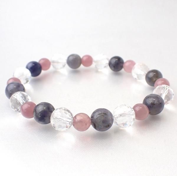 アイオライト & ディープローズクォーツ & 水晶 デザインブレスレット 内周14.5cm [X7669]