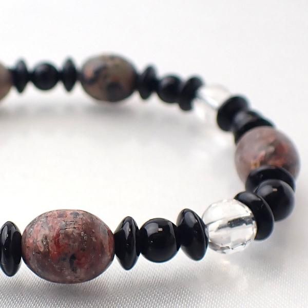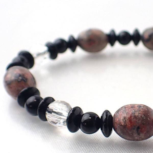 水晶 & ブラックオニキス & レッドスノーフレークオブシディアン デザインブレスレット 内周14cm [XE0039]