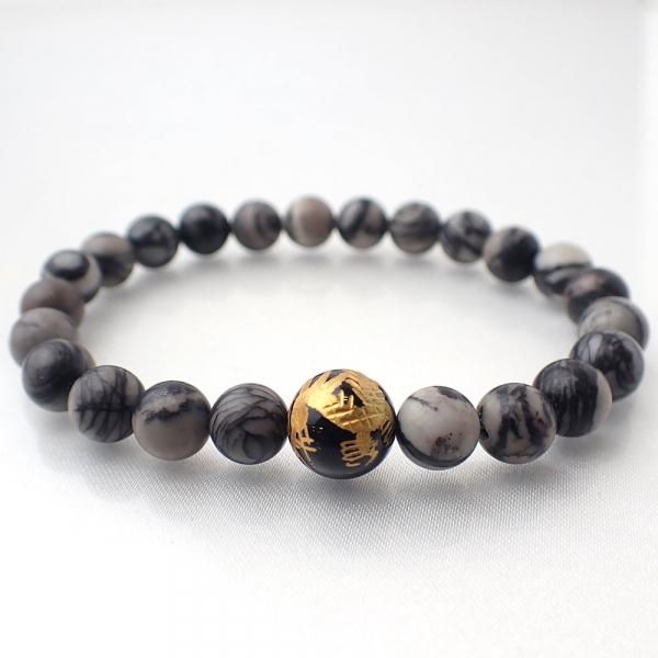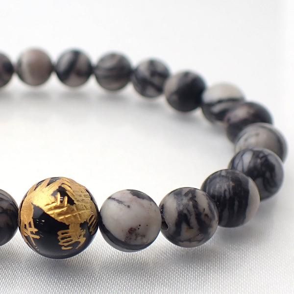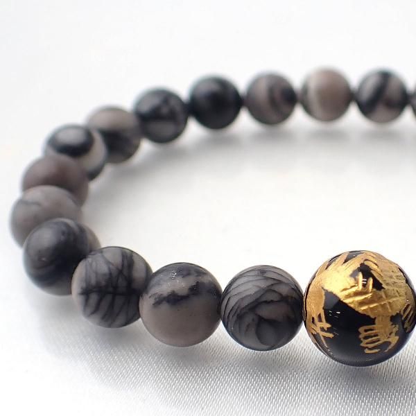 ブラックオニキス 龍彫り & ピカソジャスパー デザインブレスレット 内周15.5cm [XE0048]